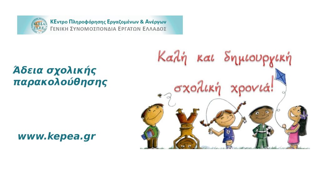 Η ΓΣΕΕ μέσω του Κέντρου Πληροφόρησης Εργαζόμενων & Ανέργων (www.kepea.gr) στο πλαίσιο έναρξης της νέας σχολικής χρονιάς, υπενθυμίζει ότι προβλέπεται η χορήγηση από τον εργοδότη άδειας σχολικής παρακολούθησης για τους γονείς παιδιών μέχρι 18 ετών, τα οποία παρακολουθούν μαθήματα στοιχειώδους ή μέσης εκπαίδευσης.