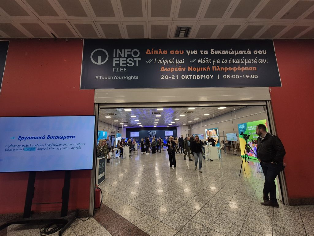 Με κεντρικό σύνθημα #touch your rights άνοιξε σήμερα τις πύλες του το INFO FEST ΓΣΕΕ, το ενημερωτικό φεστιβάλ της Συνομοσπονδίας στην καρδιά της Αθήνας, στην Αίθουσα Πολλαπλών Χρήσεων του Μετρό Συντάγματος. Εκατοντάδες πολίτες επισκέφτηκαν το χώρο του φεστιβάλ, έλαβαν έντυπο ενημερωτικό υλικό, «έπαιξαν» με τα ψηφιακά apps και ενημερώθηκαν για εργασιακά, ασφαλιστικά και καταναλωτικά θέματα.